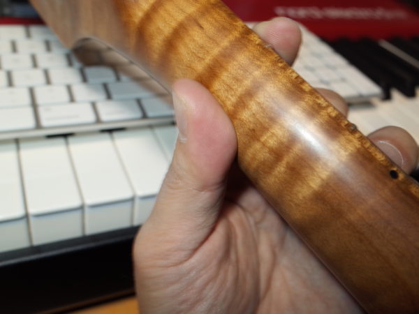 そして、親指の位置についてです。これが全ての基盤となる部分です。ネックの中央より少し下、人差し指と中指の間あたりでネックを支えるのが理想的です。