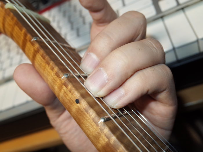 ギュッと力を込めるのではなく、指先を指板に優しく押し当てる感覚、そしてそこから指先の骨にかけて指の根元からグッと指先を弦に対して押し込む感覚が大切です。この時、3本の指のアーチを崩さないように心がけましょう。