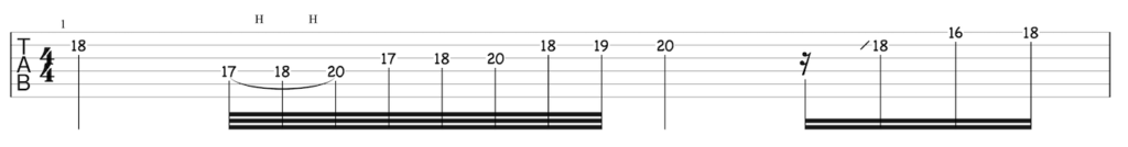 特に、途中の32分音符で駆け上がるレガート部分は、ニュアンスが少し変わりますが、異なるポジションでの演奏の方が弾きやすいかもしれません。以下、TAB譜を載せていますので、参考にして練習してみてください。