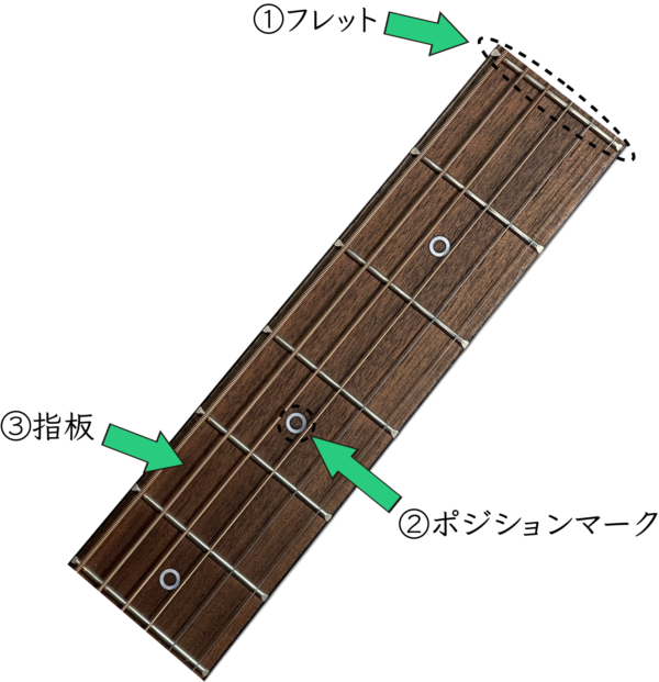 指板に対して垂直に金属が打ち込まれていますが、これをフレットと呼びます。このフレットのおかげで半音間隔で音を鳴らす事が出来ます。ヘッド側から順番に1フレット、2フレット…という風に数えていきます。