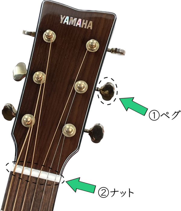 但し、意外と大きく回しても弦が切れたりする事は有りません。耳で音の変化をしっかりと感じながらペグを回していきましょう。ちなみに弦を巻き付ける箇所が6箇所ありますが、これを『ペグポスト』と呼びます。