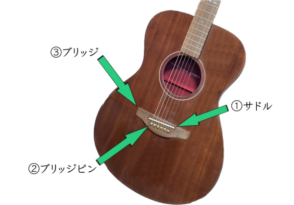 ナット部分に対してボディ側で弦を支えている箇所になります。ナット部分とこのサドルの高さをリペアで調節する事で、挫折する事無くギターが楽しめるようになります。今お持ちのギターが弾きづらいと感じる場合はリペアマンの方に頼んで調節してみましょう♪
