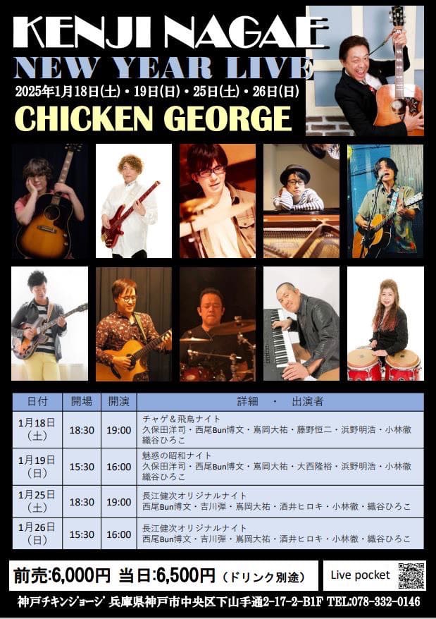 1月19日(日)、神戸のライブハウス「チキンジョージ」にて、長江健次さんの”Kenji Nagae New Year Live!”に出演させていただきます。
